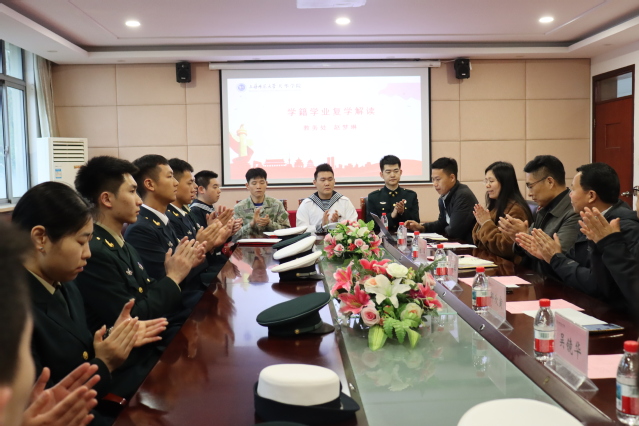 随后,各部门依次介绍支持举措。教务处赵梦琳老师围绕学籍衔接、课程补修、学业帮扶等核心问题,详解学校为退役大学生提供的学业支持,鼓励同学们传承军人作风,深耕专业学习,续写奋进篇章;资助中心吴镜华老师细致解读学费补偿代偿、安置补助、一次性经济补助等政策,确保每位学子清晰知晓权益,解决后顾之忧;就业与生涯指导中心副主任邱欣寅从就业、创业两方面介绍专项政策,将提供岗位精准推荐、职业技能培训、定向招录名额等服务,同时配套创业补贴、低息贷款、孵化基地入驻等支持,全程助力大家实现就业创业梦想。