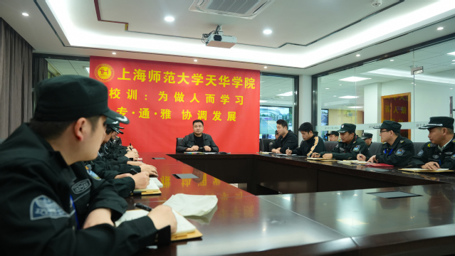 2026年4月23日下午14:00,上海师范大学天华学院保安专项技能培训总结会议在应急指挥中心召开。应急事务处理中心主任何凯、培训员及全体保安人员参加会议。会议全面总结培训成果、表彰先进个人,进一步夯实校园安全防线,提升安保队伍整体素质。